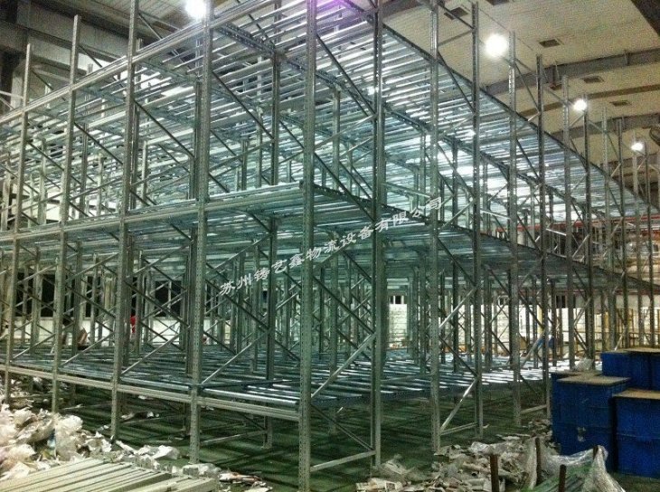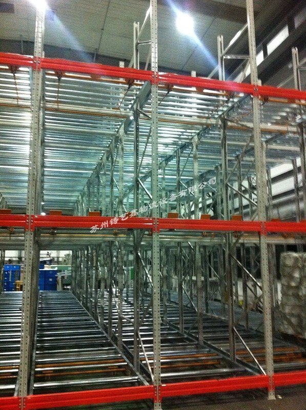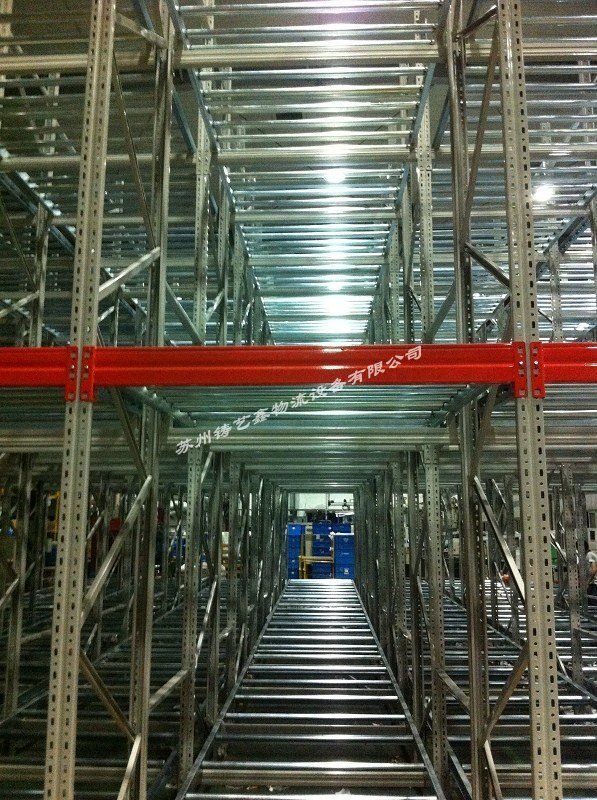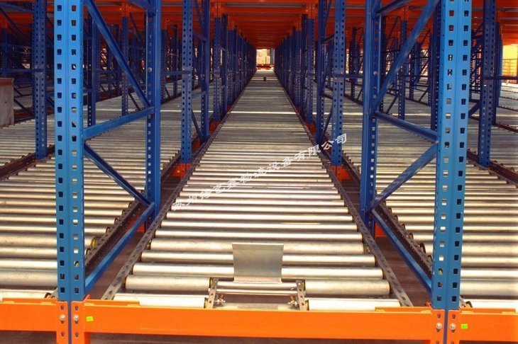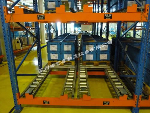 在貨架的組與組之間沒有作業(yè)通道,從而增加了60%的空間利用率,提高了倉儲的容積率;托盤操作遵循先進先出的原則;自動儲存回轉(zhuǎn);儲存和揀選兩個動作的分開大大提高輸出量,由于是自重力使貨物滑動,而且沒有操作通道,所以減少了運輸路線和叉車的數(shù)量。
