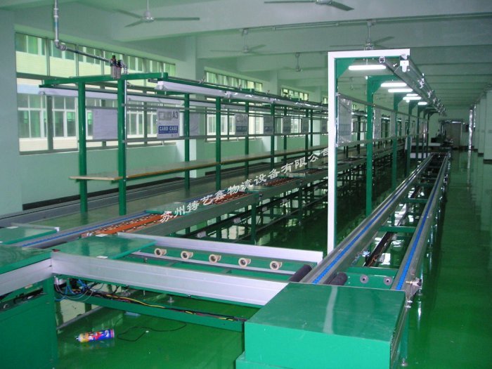 流水線又稱為裝配線,一種工業上的生產方式,指每一個生產單位只專注處理某一個片段的工作,以提高工作效率及產量;按照流水線的輸送方式大體可以分為:皮帶流水裝配線、板鏈線、倍速鏈、插件線、網帶線、懸掛線及滾筒流水線這七類流水線。一般包括牽引件、承載構件、驅動裝置、漲緊裝置、改向裝置和支承件等組成。流水線可擴展性高,可按需求設計輸送量,輸送速度,裝配工位,輔助部件(包括快速接頭、風扇,電燈,插座,工藝看板,置物臺,24V電源,風批等,因此廣受企業歡迎;流水線是人和機器的有效組合,充分體現設備的靈活性,它將輸送系統、隨行夾具和在線專機、檢測設備有機的組合,以滿足多品種產品的輸送要求。輸送線的傳輸方式有同步傳輸的/(強制式),也可以是非同步傳輸/(柔性式),根據配置的選擇,可以實現裝配和輸送的要求。輸送線在企業的批量生產中不可或缺。