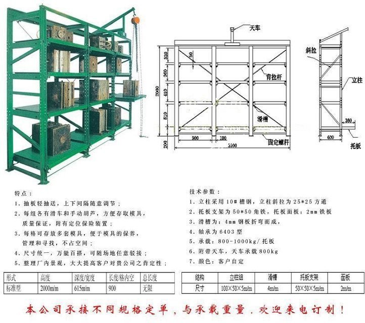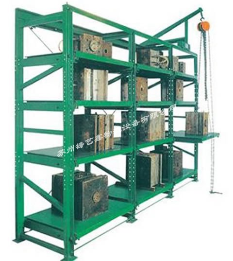 模具貨架是貨架的一種,簡稱:模具架。主要存放各種模具物品,根據層載能力要求分為輕型模具貨架和重型模具貨架。貨架頂部可配置移動葫蘆車,以方便模具的起吊。 模具貨架的特點: 1、組合裝配、主要由柱片、導向槽、抽屜層、拉桿、定位銷等,采用螺栓連接,結構穩定可靠,一般成排使用。 2、抽屜盤主要由滑軌、抽屜盤組成。抽屜盤由矩管加折彎件焊接而成的框架和鋼板組成。 每條滑軌由兩個軸承前后上下固定,可以在導向槽內隨意滾動,阻力小,可以輕松拉出抽屜。 3、模具貨架的抽屜盤出于考慮,設計了定位銷和限位銷,以保證抽屜盤在抽出時保證。 4、輕型模具貨架層載在200到800kg/層。重型抽屜式貨架層載在:800到1500kg/層。 5、模具貨架占地少、層重大、分類詳細、操作簡單。 6、模具貨架還可以在貨位式貨架的橫梁上做抽屜盤,成本跟節約,結構更穩固。